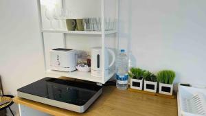 The one-bedroom apartment includes a living room with a flat-screen TV and free Wi-Fi throughout. Guests have access to an equipped kitchenette featuring a microwave and fridge. The private bathroom contains a walk-in shower, free toiletries, and a hairdryer. Towels and bed linen are provided.