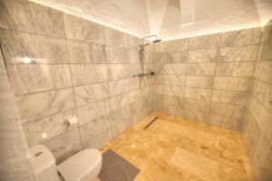 This two-bedroom apartment features a kitchen equipped with a microwave and toaster alongside a seating area furnished with a sofa and table. Entertainment includes a flat-screen television, while the two bathrooms each contain showers and hairdryers. The flooring consists of tile or marble surfaces, complemented by heating for added comfort.