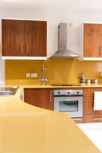 The spacious flat includes two bedrooms alongside two bathrooms equipped with both a bathtub and shower. The living room features a sofa and flat-screen TV for relaxation, while the kitchen is fully equipped with an oven, microwave, and other essentials. Towels and bed linen are supplied, ensuring comfort during your stay.