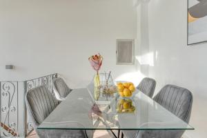 This spacious apartment features three bedrooms and three bathrooms, providing bed linen and towels for guests' convenience. The living area includes a flat-screen TV with streaming services and a dining space adjacent to a fully equipped kitchen fitted with kitchenware, dishwasher, coffee machine, electric kettle, and wine glasses. Guests enter through a private entrance leading to an outdoor terrace where they can enjoy meals or relax while appreciating the sea view.