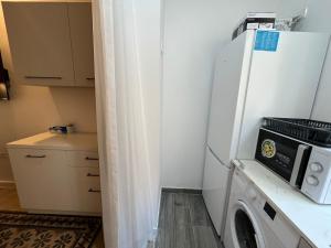Guests have access to a fully equipped kitchen featuring an oven, microwave, toaster, refrigerator, and electric kettle. The living area includes a sofa bed and a wardrobe or closet. Entertainment options include satellite TV with free Wi-Fi throughout the apartment.