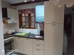The apartment includes one bedroom, a fully equipped kitchen separated from the living area, and one bathroom. Entertainment is provided by a flat-screen television in the seating area. Guests also have access to heating for colder weather and can use an on-site washing machine.