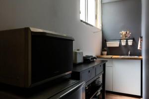 The apartment includes a fully equipped kitchenette featuring a microwave and toaster, as well as a washing machine in the bathroom. Guests can relax on the convertible sofa while watching the flat-screen TV in the seating area. The bathroom offers toiletries such as shampoo and soap along with a shower.